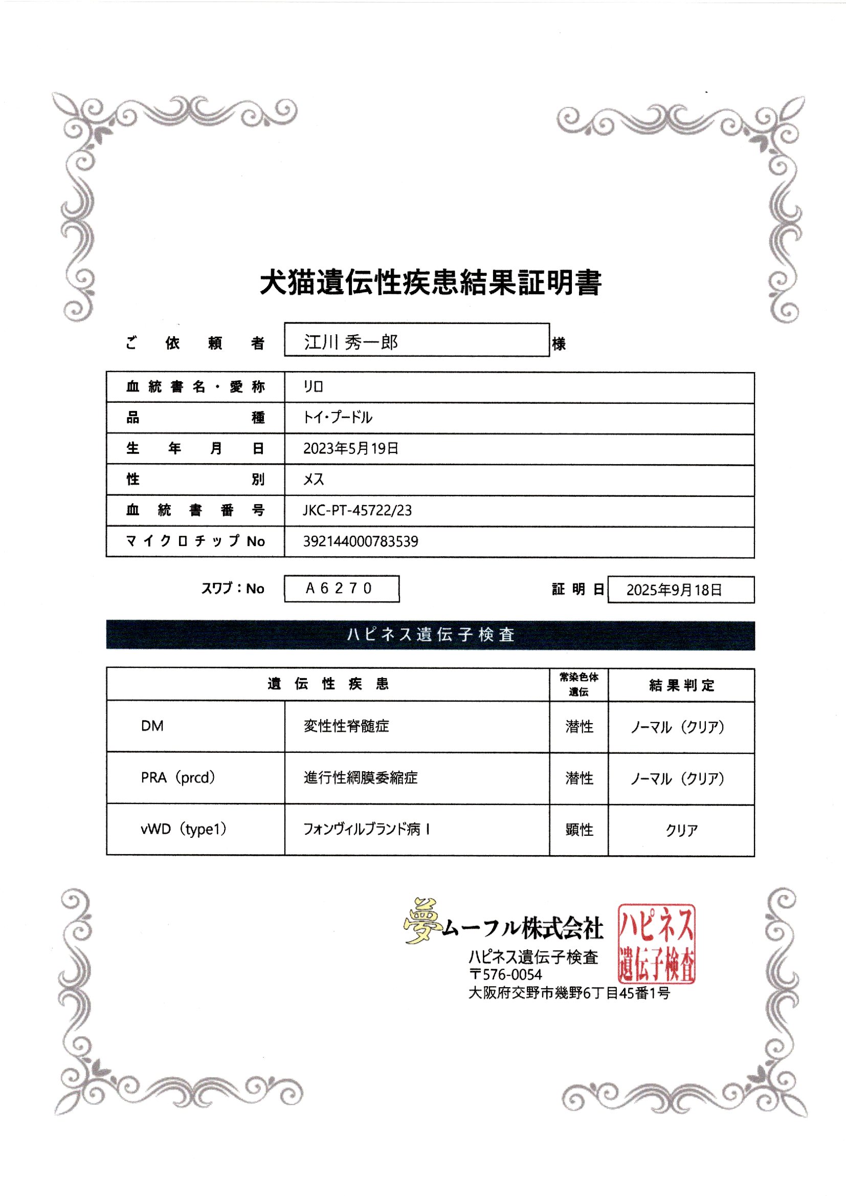 ★ワクチン1回目とマイクロチップ、血統書は生体価格に入っています。