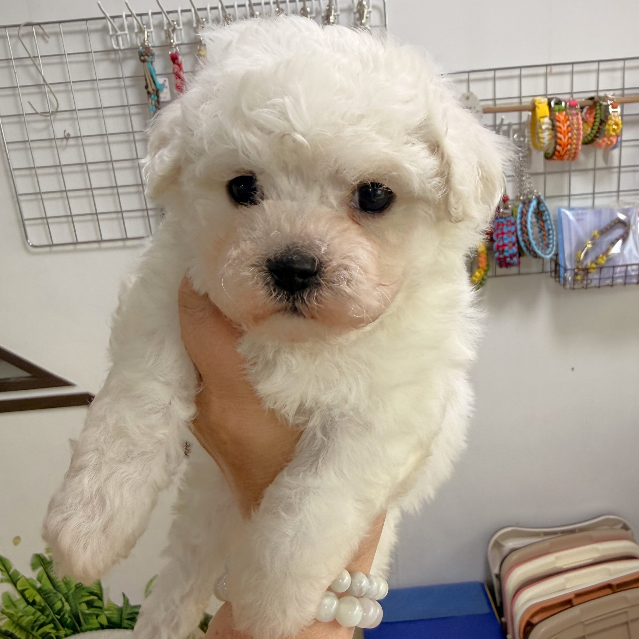 BFR26-007(ビションフリーゼ) 3/18撮影 Wanコメント ビションフリーゼの仔犬ちゃんです。 ビションはコミュニケーション能力が高く、とてもフレンドリーで人や他の動物とも仲良くやっていける社交性があり、従順で飼いやすい性格です。 飼いやすさと可愛さで多頭飼いされる人が多いです!! パパ犬/マックス 5kg ママ犬/アリエル 3.5kg 3頭兄妹のビションフリーゼの仔犬ちゃんです。 オレンジ色首輪の男の子 * 毛量・骨格構成・噛み合わせ等、問題ありません * 成犬時予想サイズは、4~5kg * お引き渡し可能日は、4/6~ * ご見学大歓迎! * お問い合わせお待ちしております。 ★ワクチン1回目とマイクロチップ、血統書は生体価格に入っています。 ★ペット保険にお申し込みの際は、別途料金が必要です。 ★クレジットカード・ペイペイ・楽天ペイも使えます! ★適格請求書発行できます。 ★当店では、子犬の販売は見学予約順ではなく購入予約順でお譲りしております。 もしも他のお客様から先に購入予約があった場合、ご案内出来なくなりますので、あらかじめご了承ください。 ★子犬価格の30%を予約金としてお支払いいただければ、他のお客様からのお問い合わせを受け付けせず、商談中の状態へと切り替えさせていただきます。 残金につきましては引き渡し日当日にお支払いください。 お客様都合によるキャンセルの場合、予約金は返金できませんのでご了承ください。 ++++++++++++++++++ 仲介サイトからお越しの方へ・・・ 仲介サイトを通してのお値段と店頭価格では、当店が仲介サイトに支払う手数料等がかかる為誤差が生じます。 その場合は申し訳ありませんが、仲介サイトに掲載の価格でお話を進めさせていただきます。 ++++++++++++++++++ 是非とも、直接のご連絡頂けるようお願い致します。 誕生日 2026/2/8 性別 男の子 体重 3/22現在 885g カラー ホワイト 価格 ご家族様が決まりました。 ファミリー マックス(ビションフリーゼ)遺伝子検査クリアです!詳細を見る アリエル (ビションフリーゼ)ママ犬は、ヒメ ・ パパ犬は、シンバ 3.5kgの小さめビションです。 元気で明るい性格 遺伝子検査はクリアです。 変性性脊髄症(DM)詳細を見る