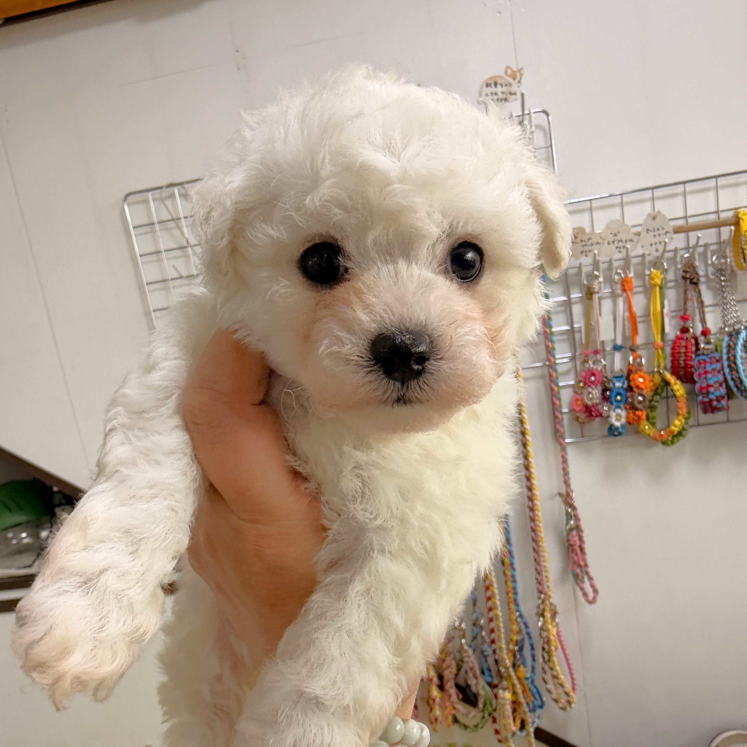 BFR26-008(ビションフリーゼ) 3/18撮影 Wanコメント ビションフリーゼの仔犬ちゃんです。 ビションはコミュニケーション能力が高く、とてもフレンドリーで人や他の動物とも仲良くやっていける社交性があり、従順で飼いやすい性格です。 飼いやすさと可愛さで多頭飼いされる人が多いです!! パパ犬/マックス 5kg ママ犬/アリエル 3.5kg 3頭兄妹のビションフリーゼの仔犬ちゃんです。 紺色首輪の男の子 * 毛量・骨格構成・噛み合わせ等、問題ありません * 成犬時予想サイズは、4~5kg * お引き渡し可能日は、4/6~ * ご見学大歓迎! * お問い合わせお待ちしております。 ★ワクチン1回目とマイクロチップ、血統書は生体価格に入っています。 ★ペット保険にお申し込みの際は、別途料金が必要です。 ★クレジットカード・ペイペイ・楽天ペイも使えます! ★適格請求書発行できます。 ★当店では、子犬の販売は見学予約順ではなく購入予約順でお譲りしております。 もしも他のお客様から先に購入予約があった場合、ご案内出来なくなりますので、あらかじめご了承ください。 ★子犬価格の30%を予約金としてお支払いいただければ、他のお客様からのお問い合わせを受け付けせず、商談中の状態へと切り替えさせていただきます。 残金につきましては引き渡し日当日にお支払いください。 お客様都合によるキャンセルの場合、予約金は返金できませんのでご了承ください。 ++++++++++++++++++ 仲介サイトからお越しの方へ・・・ 仲介サイトを通してのお値段と店頭価格では、当店が仲介サイトに支払う手数料等がかかる為誤差が生じます。 その場合は申し訳ありませんが、仲介サイトに掲載の価格でお話を進めさせていただきます。 ++++++++++++++++++ 是非とも、直接のご連絡頂けるようお願い致します。 誕生日 2026/2/8 性別 男の子 体重 3/22現在 850g カラー ホワイト 価格 ご家族様が決まりました。 ファミリー アリエル (ビションフリーゼ)ママ犬は、ヒメ ・ パパ犬は、シンバ 3.5kgの小さめビションです。 元気で明るい性格 遺伝子検査はクリアです。 変性性脊髄症(DM)詳細を見る